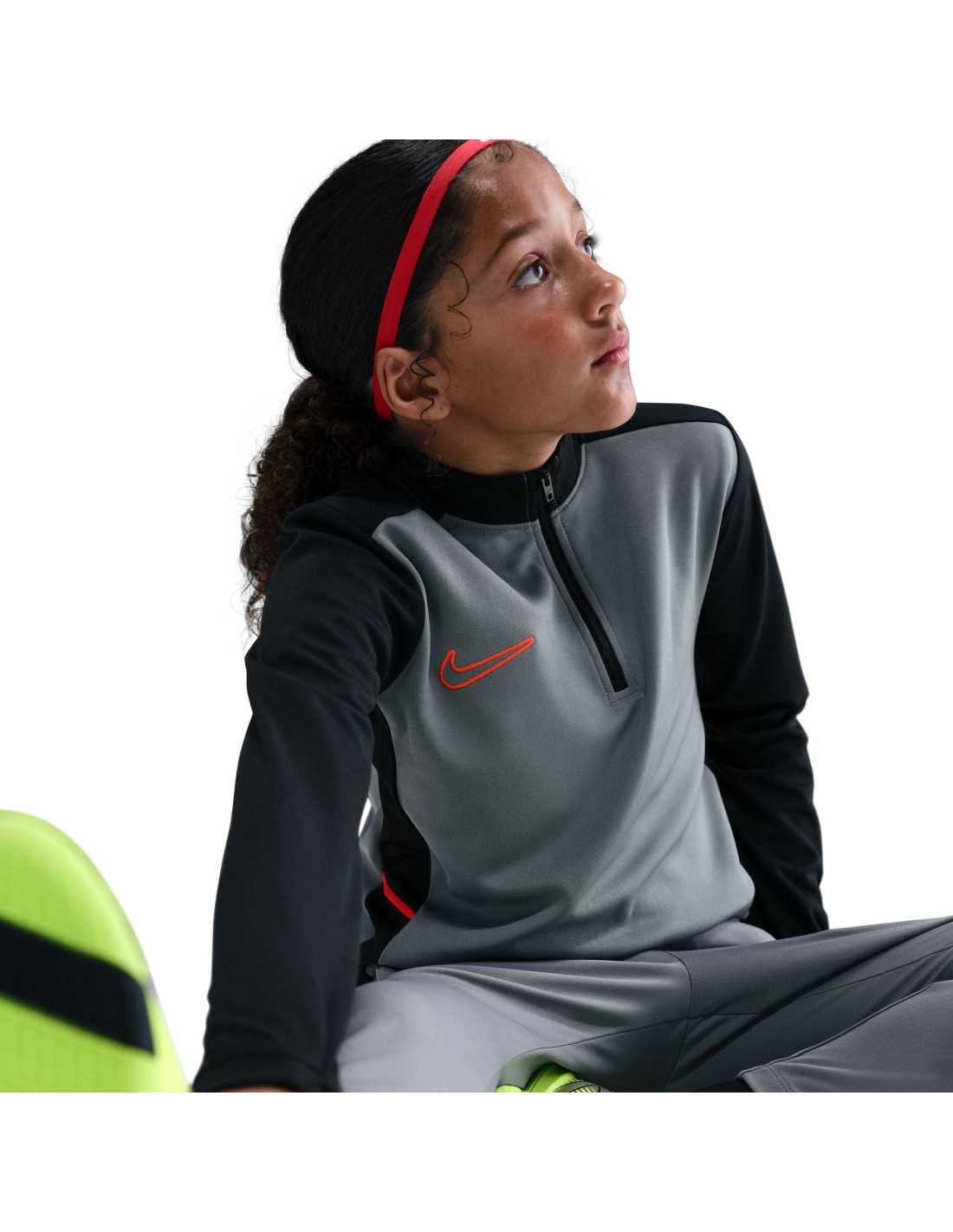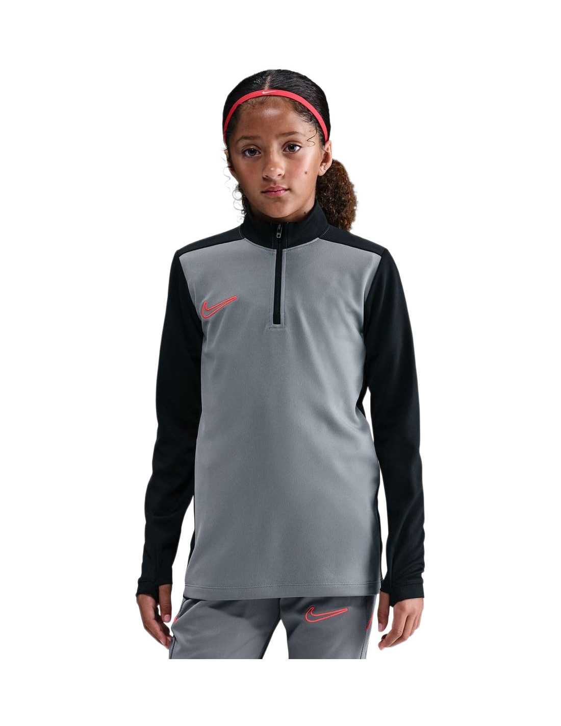 The Nike Academy training shirt is designed for kids to take their skills to the highest level. Made with soft Knit fabric and Nike's advanced Dri-FIT technology, which wicks away sweat, this shirt ensures breathability and comfort during practice. Innovative features like thumb holes allow for greater coverage and ensure the sleeves stay in place while moving. Additionally, the mesh side panels optimize ventilation, and the 1/4 zip design provides extra protection when closed and increased ventilation when open.