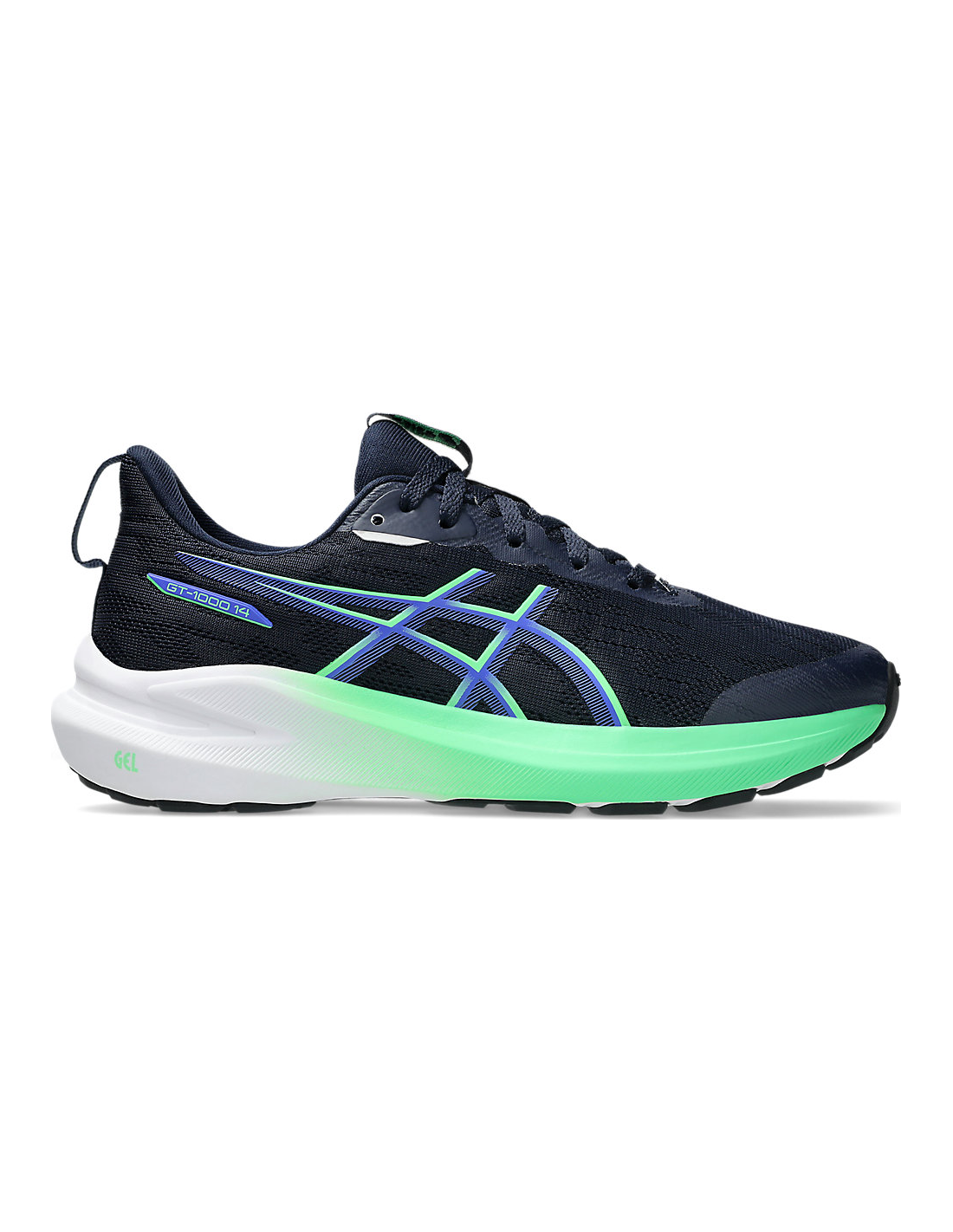 The GT-1000™ 14 GS running shoe offers a versatile design that combines comfort and durability, ideal for active kids. This model is specifically designed for growing feet, incorporating a kid-specific last and a size checker on the insole. The outsole with medial wrap in the forefoot and the rubber stitching on the toe cap enhance its durability, while the GEL™ technology in the heel provides excellent cushioning for daily comfort. The upper mesh fabric is lightweight and durable, providing a cool and dry environment.