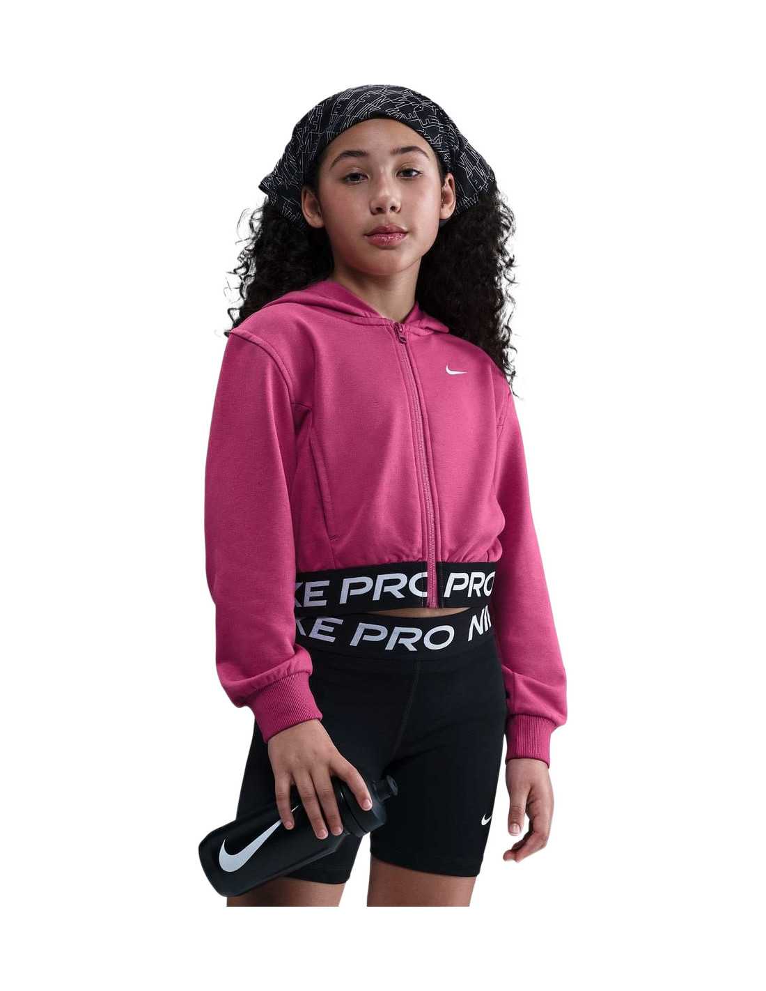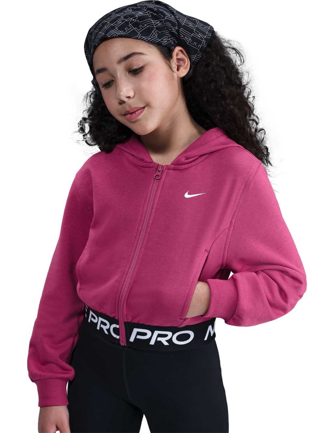 The Nike Pro Fleece hoodie takes comfort to the next level with breathable French Terry fabric and sweat-wicking Dri-FIT technology. Its professional design combines safety and style, incorporating eye-catching details into any outfit. The slightly cropped design and classic fit allow for great freedom of movement, while the wide jacquard hem adds a traditional Nike Pro touch. Perfect for performance, this hoodie is an excellent addition to any active girl's wardrobe.