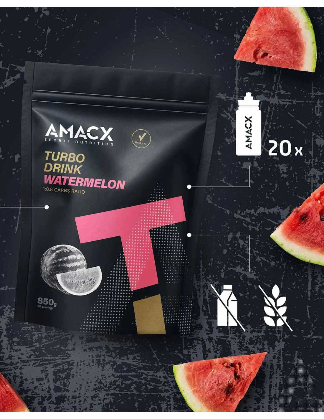 The AMACX Turbo Drink in Watermelon flavor is designed to replenish energy during prolonged and demanding training sessions. With a content of 40 grams of carbohydrates per bottle, this drink offers an optimal ratio of glucose and fructose (1:0.8), allowing efficient absorption without causing digestive discomfort. Ideal for efforts lasting more than 2 hours, it is available in Lemon and Watermelon flavors, and provides essential electrolytes like potassium and calcium for optimal performance.