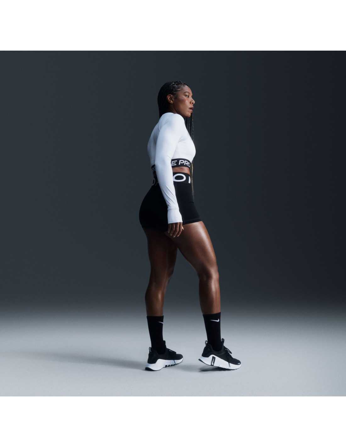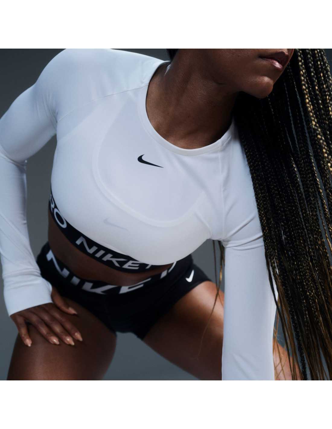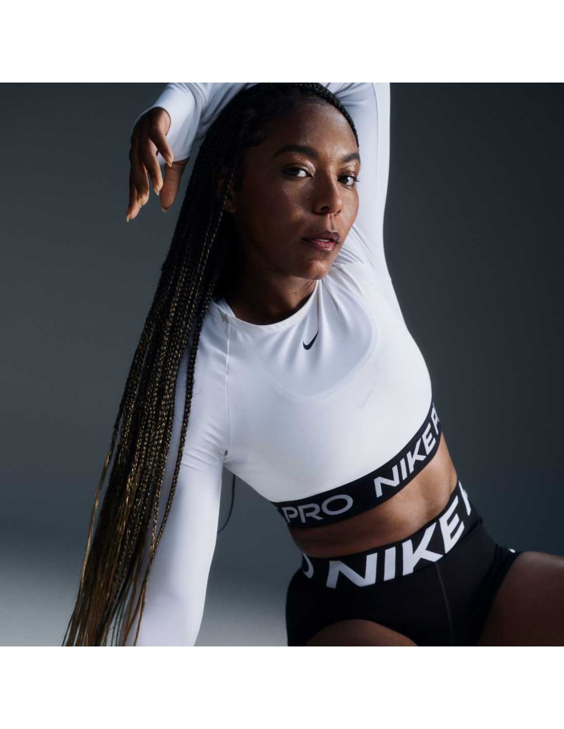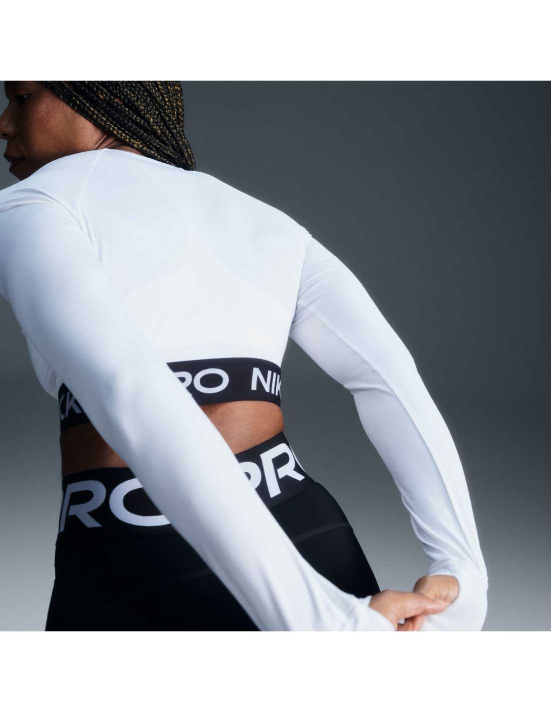 The Nike Pro long-sleeve cropped top is designed to deliver maximum performance during workouts. Made with lightweight, soft, and stretchy fabric, it dries quickly to ensure comfort even in the most intense sessions. Its snug fit and jacquard elastic band at the hem ensure it stays in place as you move, providing security. This garment combines style and functionality, utilizing Nike Dri-FIT technology to wick sweat away from the skin, and includes thumbholes that add protection and stability to the sleeves.