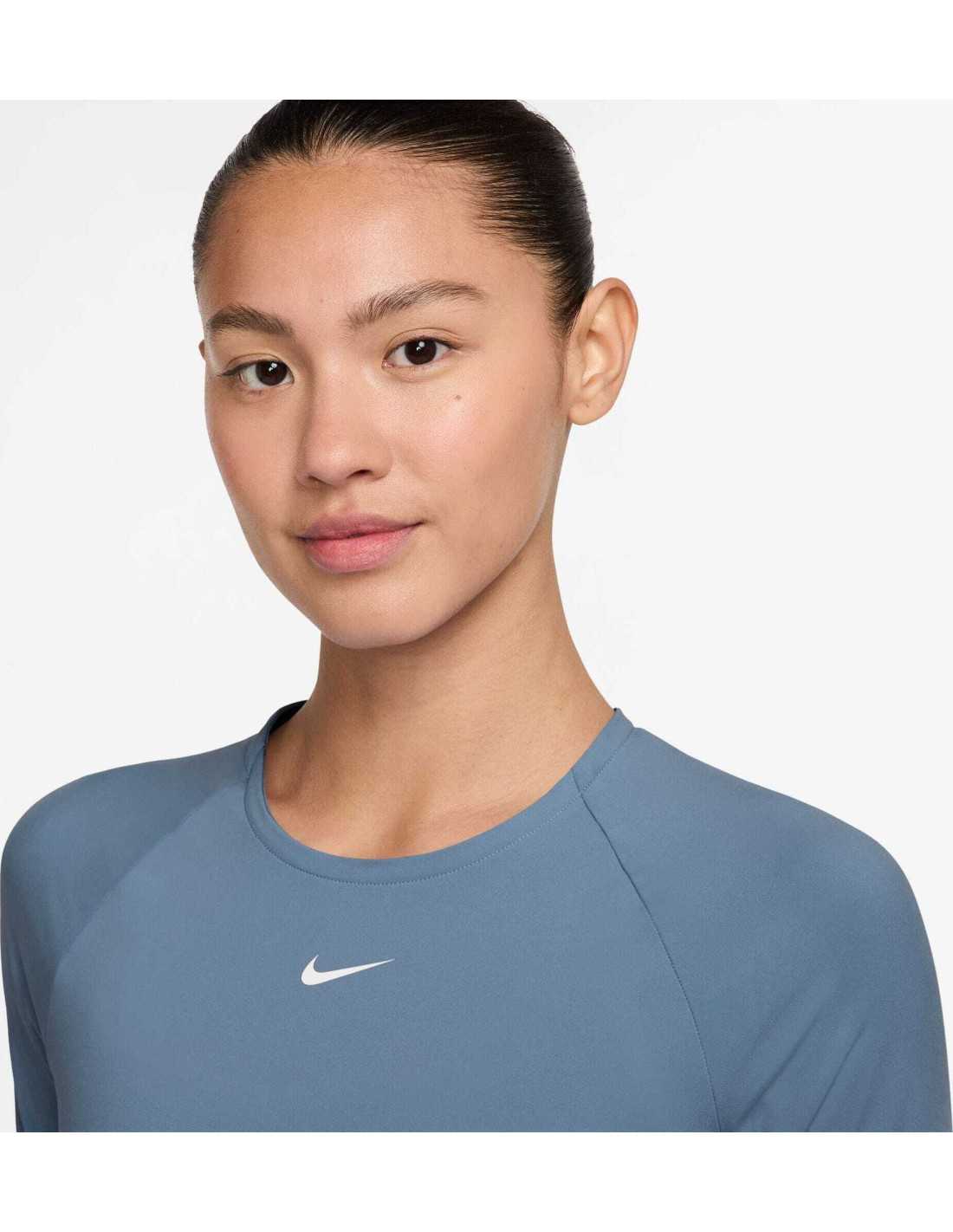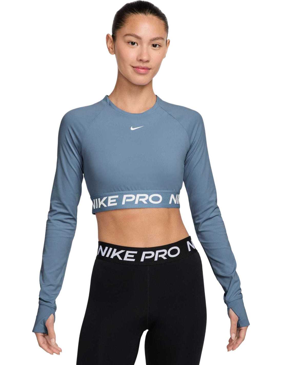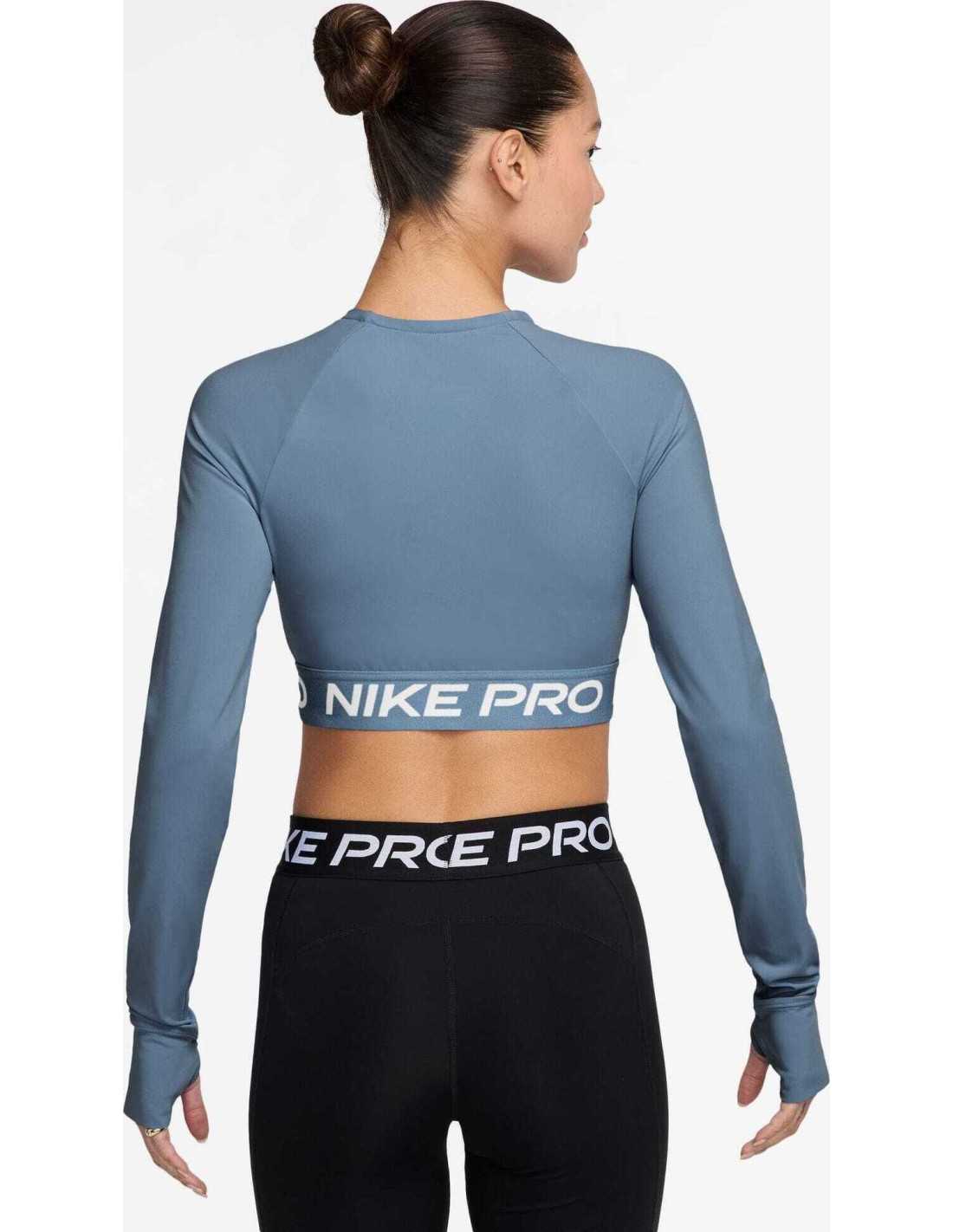 The Nike Pro long-sleeve cropped top is designed to deliver maximum performance during workouts. Made with lightweight, soft, and stretchy fabric, it dries quickly to ensure comfort even in the most intense sessions. Its snug fit and jacquard elastic band at the hem ensure it stays in place as you move, providing security. This garment combines style and functionality, utilizing Nike Dri-FIT technology to wick sweat away from the skin, and includes thumbholes that add protection and stability to the sleeves.