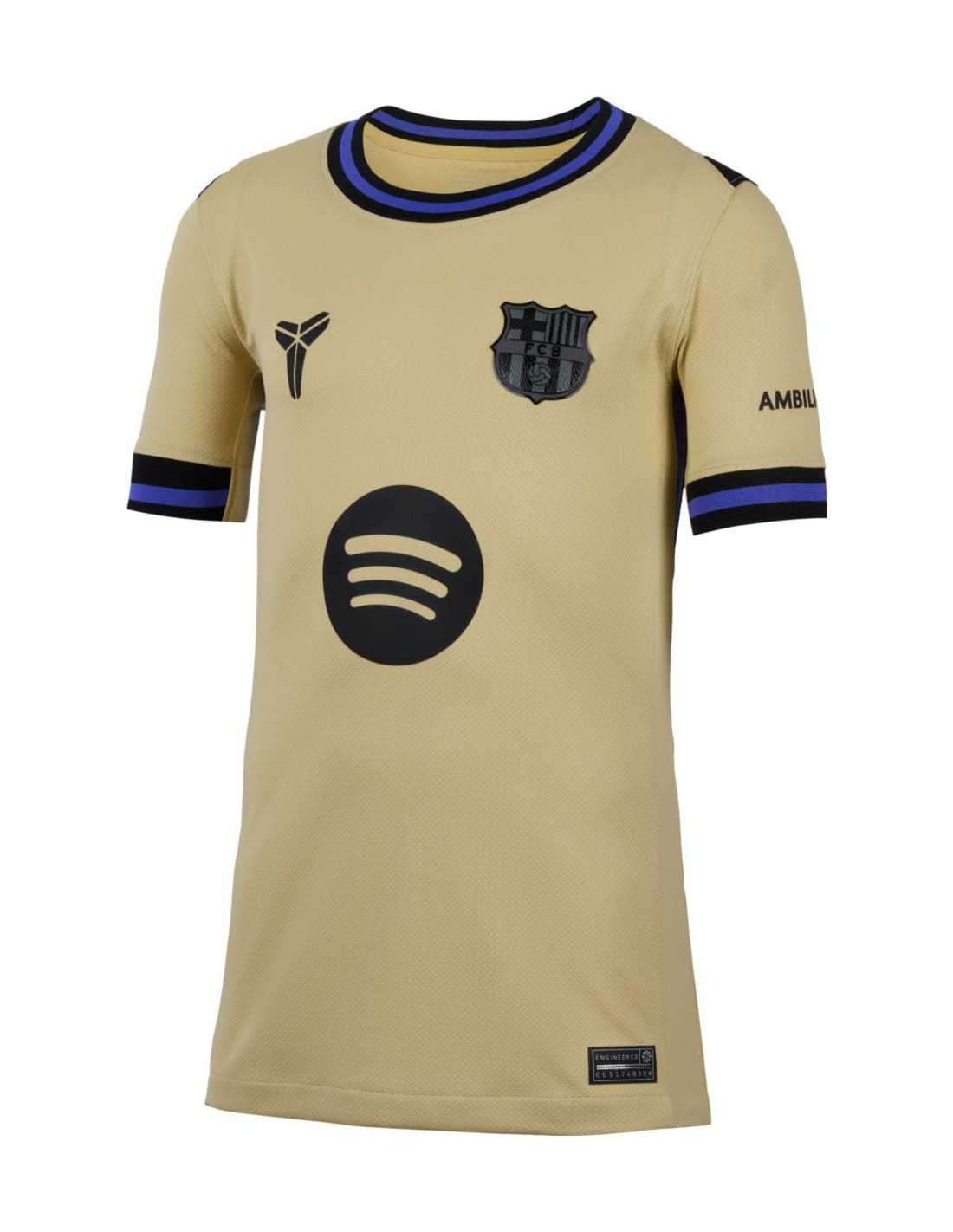 La camiseta de fútbol réplica Segunda Equipación Stadium FC Barcelona 2025/26 para niños está diseñada para los jóvenes aficionados que quieren canalizar la mentalidad Mamba el día del partido. Este modelo rinde homenaje a la conexión entre Kobe Bryant y el FC Barcelona, fusionando el legado de dos íconos más allá del deporte. Fabricada con la tecnología Nike Dri-FIT, la camiseta asegura transpirabilidad y comodidad, permitiendo que el sudor se aleje de la piel durante el juego. Inspirada en las míticas camisetas doradas del club, presenta un diseño moderno con detalles de piel de serpiente y un escudo estampado por transferencia térmica.