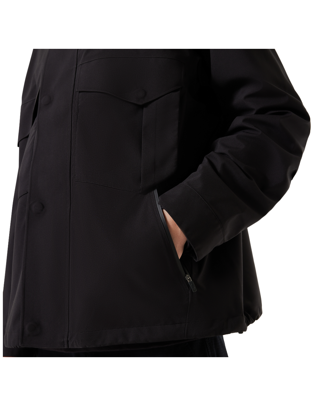 • Bolsillos laterales ocultos con cremalleras impermeables