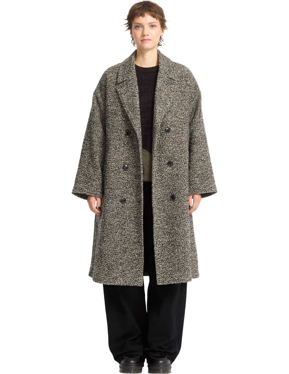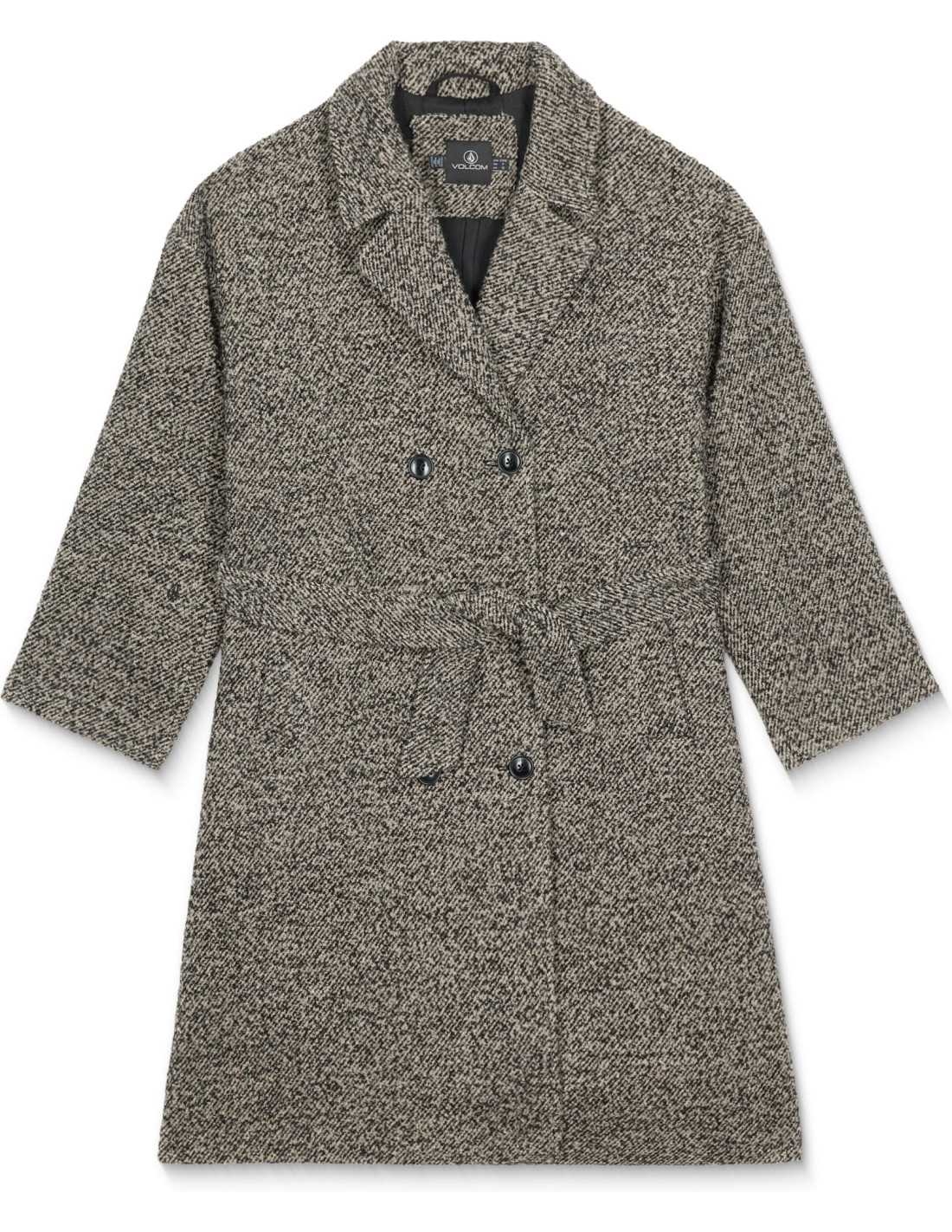 Este elegante abrigo largo de Volcom, diseñado específicamente para mujeres, combina estilo y sostenibilidad. Confeccionado con tejido de twill texturizado en un sofisticado patrón blanco y negro, este abrigo cuenta con un corte amplio que ofrece comodidad y un toque moderno. Su diseño incluye un cierre frontal con seis botones, un cinturón extraíble a juego para ajustar a la cintura, y un práctico bolsillo con ojal en la parte inferior. Ideal para completar cualquier conjunto de temporada, este abrigo también destaca por su compromiso con el medio ambiente al estar hecho con al menos un 30 % de poliéster reciclado.
