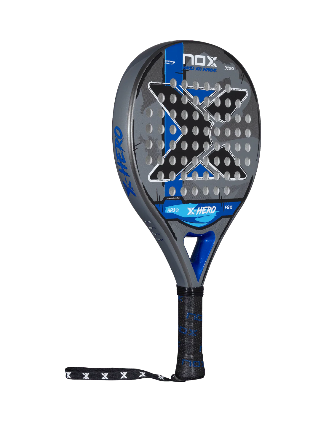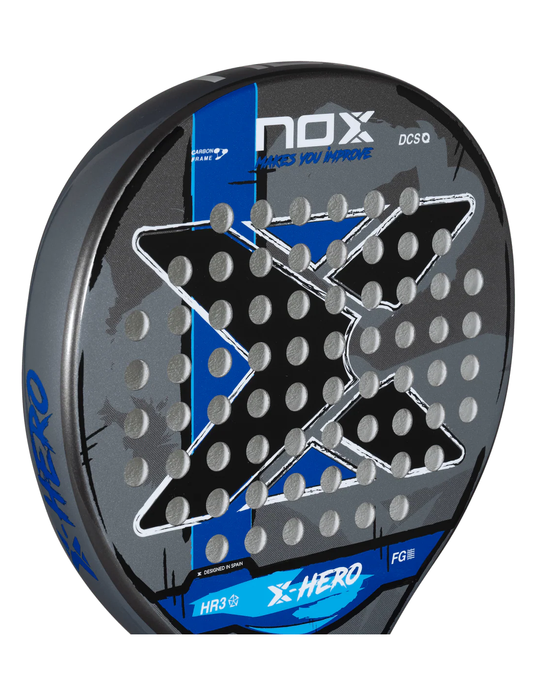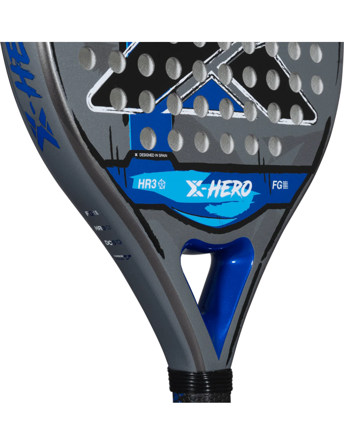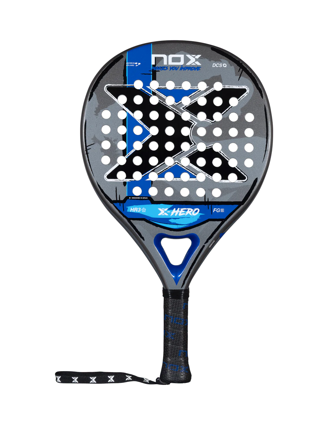 La pala de pádel NOX X-Hero Blue es perfecta para jugadores principiantes e intermedios que buscan un equilibrio ideal entre consistencia, confort y manejabilidad en cada partido o entrenamiento. Su diseño de forma redonda y el uso de materiales avanzados aseguran un control excepcional en cada golpe, ofreciendo una experiencia dinámica y divertida en la pista. Esta pala incorpora tecnologías de gamas superiores, como el núcleo de goma HR3 que potencia la fuerza y el tacto, un marco de carbono que proporciona resistencia y estabilidad, y caras de fibra de vidrio 3K que optimizan la salida de bola.