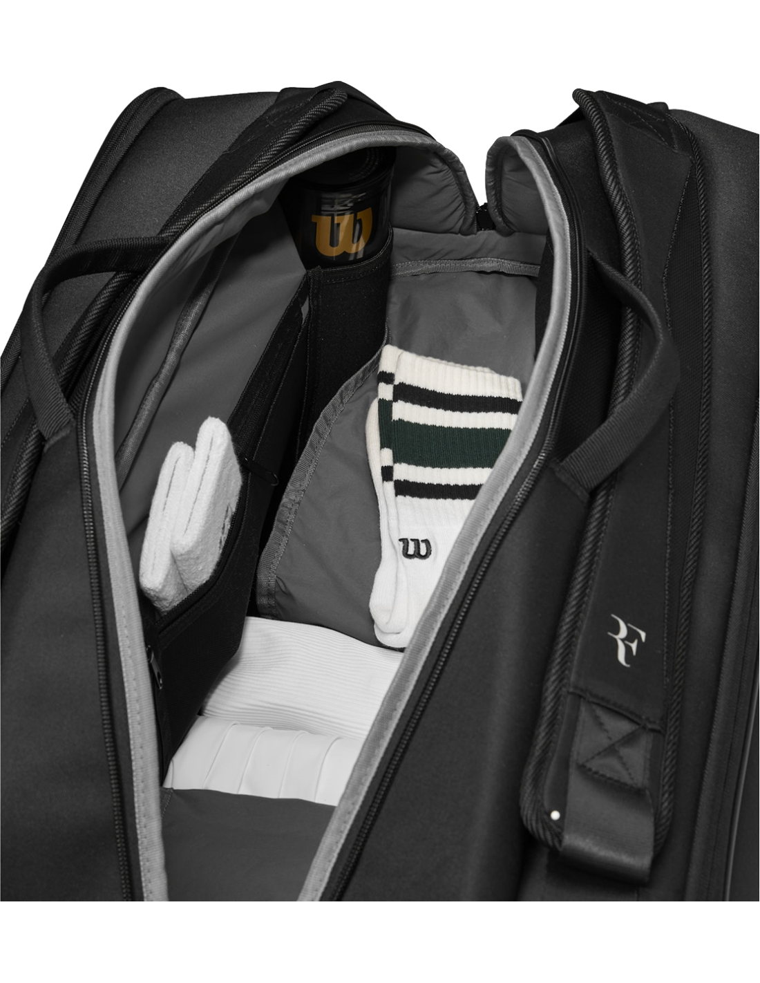 Un buen equipamiento merece un trato especial. La bolsa para raquetas Wilson RF Tournament es una bolsa de nivel profesional con un diseño inspirado en los majestuosos Alpes suizos, un tema que se repite en toda la colección de Roger Federer. Esta bolsa de tenis de rayas muestra el logotipo de RF y está decorada con tiradores de cremallera de RF de primera calidad. Es lo suficientemente espaciosa para albergar hasta 15 raquetas e incluye dos bolsillos laterales más un compartimento para zapatos. Un forro Thermoguard en dos bolsillos mantiene las raquetas y la tensión de las cuerdas protegidas de las temperaturas extremas.