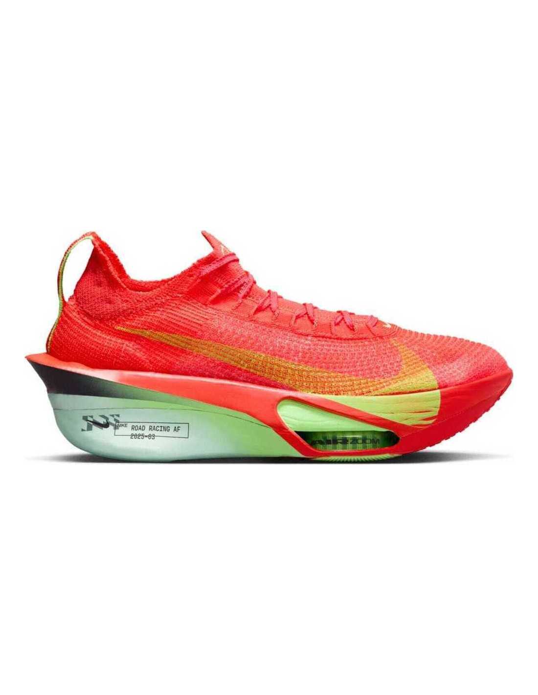Las Nike Alphafly 3 son unas zapatillas de competición diseñadas para asfalto, ideales para maratones y carreras de larga distancia. Estas zapatillas han sido perfeccionadas para maximizar la velocidad y rendimiento del corredor gracias a sus tres tecnologías innovadoras. Las unidades Air Zoom dobles en el antepié, junto con la mediasuela de espuma ZoomX, ofrecen un retorno de energía impresionante, mientras que la placa de fibra de carbono de longitud completa asegura una propulsión eficiente y transiciones suaves. Este modelo se destaca por ser el Alphafly más ligero hasta el momento, incorporando una parte superior Atomknit mejorada que proporciona una excelente transpirabilidad y contención. Además, los cordones ranurados y la lengüeta tejida integrada con acolchado aumentan la comodidad durante toda la carrera.