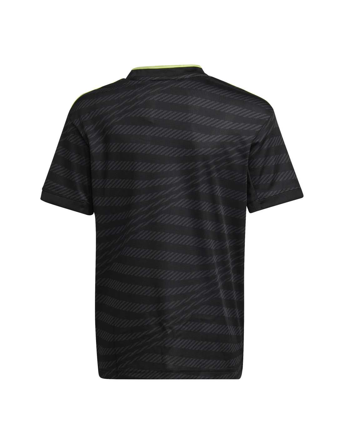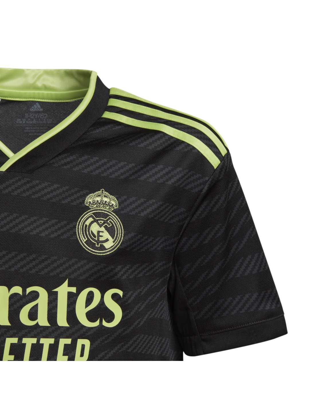 Le maillot de la troisième tenue du Real Madrid pour la saison 22/23, conçu pour les jeunes fans, célèbre plus de 120 ans de succès du club. Inspiré par l'esthétique renouvelée du stade Bernabéu, il présente des lignes ondulées qui évoquent les larges courbes de l'enceinte. Les détails brodés en vert citron avec une touche métallique reflètent l'extérieur argenté du stade. Avec la technologie AEROREADY et des panneaux en maille, le confort est garanti dans les gradins. De plus, il contribue à la durabilité, car il est fabriqué à 100 % avec des matériaux recyclés, promouvant la réduction des déchets plastiques.
